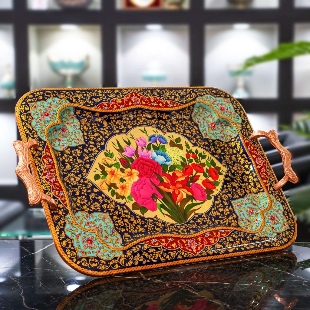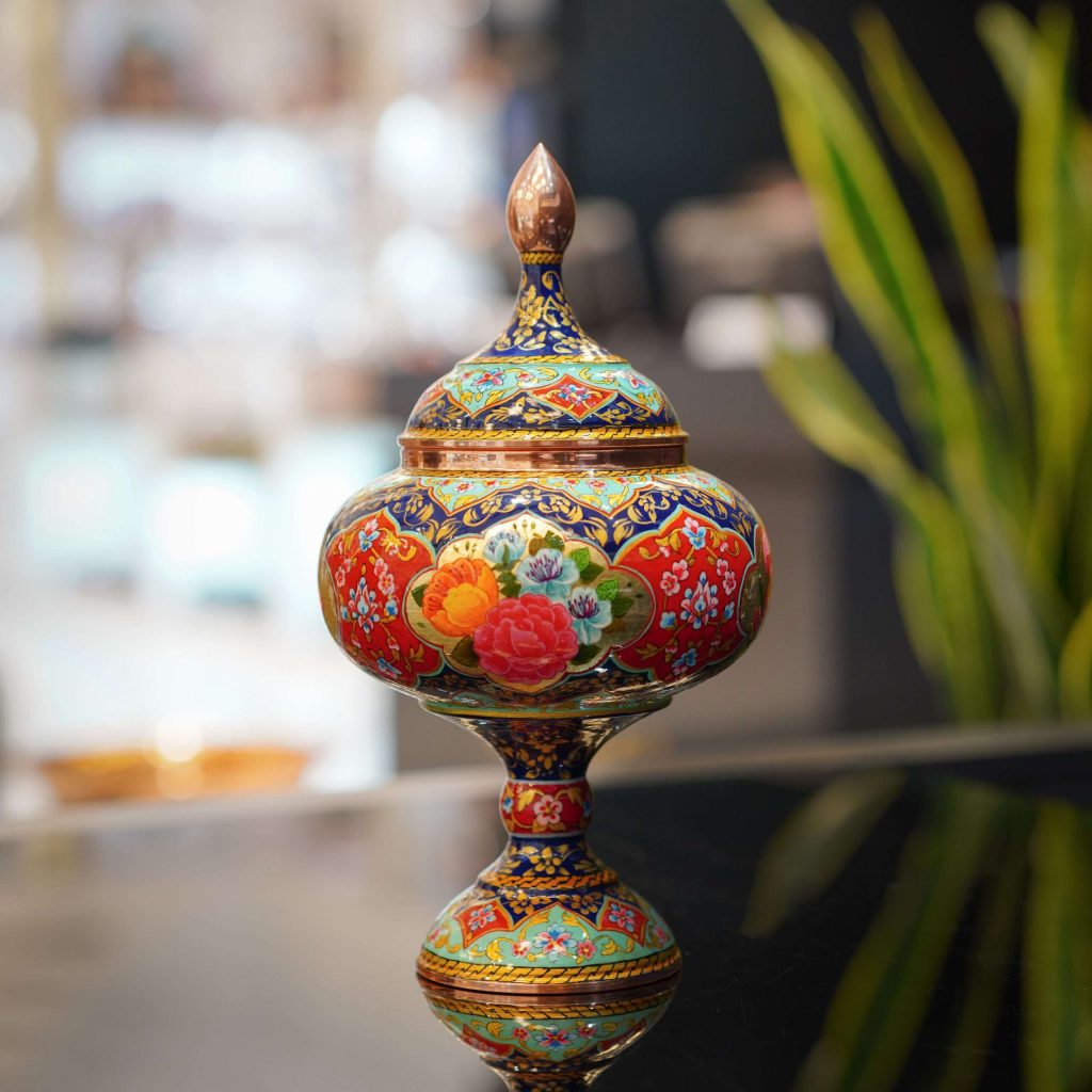 يعكس هذا الفن التقليدي، المتوارث عبر الأجيال، عمق الثقافة الإيرانية وحرفيتها الراقية. من الصناديق والصواني المزخرفة إلى أباريق القهوة الأنيقة، كل قطعة هي احتفاء بالتفاصيل والتناغم والتراث.
